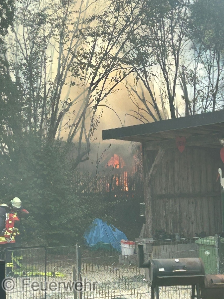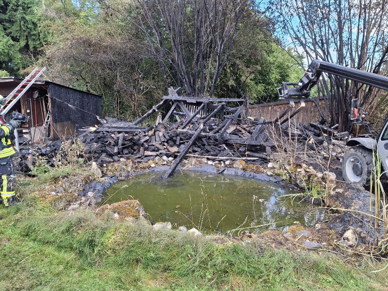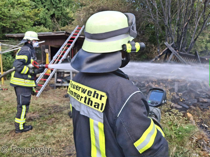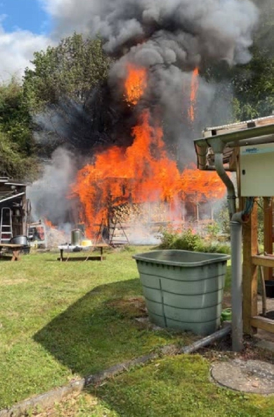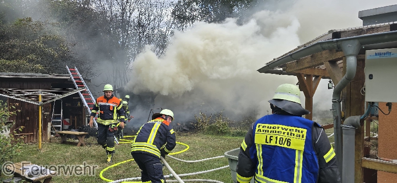 Zum gemeldeten Scheunenbrand wurde die Feuerwehr Ammerthal mit zahlreichen weiteren Wehren alarmiert. Vor Ort stellte sich für uns folgende Lage dar, ein Holzlager 10x4m mit rund 11 Ster Holz brannte und drohte auf den angrenzenden Wald sowie das Ferienhaus und Geräteschuppen überzugreifen. Sofort wurde ein Trupp unter Atemschutz zur Brandbekämpfung mittels Schnellangriff vorgeschickt um die Flammen niederzuschlagen. Derweil wurde die Wasserversorgung zum Unterflurhydrant und zum Verteiler hergestellt, um mit 2 weiteren Stahlrohren bis zum Eintreffen weiterer Einsatzkräfte das Feuer einzudämmen. Zwischenzeitlich waren bis zu 4 Trupps unter Atemschutz parallel im Einsatz um die Brandlast auseinander zu ziehen und abzulöschen. Von den nachrückenden Wehren wurde eine 2. Wasserversorgung aufgebaut.